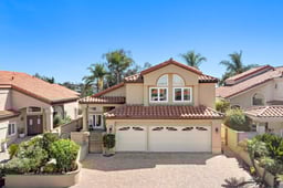 Welcome to this exquisitely upgraded 5-bedroom, 3.5-bathroom home offering 3,018 sq. ft. of luxurious living space, perfectly situated on an expansive lot with a partial scenic ocean view. From the moment you arrive, the Tuscan-inspired exterior makes a striking impression with custom-designed Renaissance windows and doors, professionally landscaped planter areas, high-end entry gates, and a sweeping decorative Olsen Pavers driveway leading to a spacious 3-car garage—delivering exceptional curb appeal. Step through the grand arched double doors and you'll immediately feel the pride of ownership in every detail. The entry opens into a warm and welcoming living and dining area with rich, handscraped Rustic Walnut wood flooring that flows seamlessly throughout much of the downstairs. Ideal for multigenerational living, a private, large downstairs bedroom with en-suite bath offers comfort and flexibility. The family room is an inviting retreat featuring a custom fireplace and opens into a bright and airy vaulted sunroom/office through elegant French doors. Bathed in natural light from expansive Renaissance arched windows, this versatile space is perfect for working, relaxing, or entertaining. The open-concept kitchen is a chef’s dream—featuring a stunning arched picture window with backyard views, granite countertops, designer tile backsplash, top-of-the-line KitchenAid appliances, and a generously sized walk-in pantry with custom shelving. Upstairs, the expansive primary suite is a true sanctuary, complete with a spacious retreat area that can easily function as an additional bedroom or private lounge. The spa-inspired en-suite bath is beautifully appointed with marble floors and walls, an Aruba Gold travertine shower, and matching vanity countertops that add elegance and warmth. All bathrooms throughout the home have been equally upgraded with luxurious finishes. Step outside to a beautifully landscaped backyard oasis with lush greenery, an elaborate Olsen Pavers patio, and thoughtfully designed planter areas—perfect for entertaining or enjoying the peaceful coastal breeze. From here, take in the partial ocean view and serene atmosphere. This home is truly a rare find—thoughtfully upgraded, meticulously maintained, and move-in ready. You will be impressed by the exceptional quality, attention to detail, and timeless design throughout.