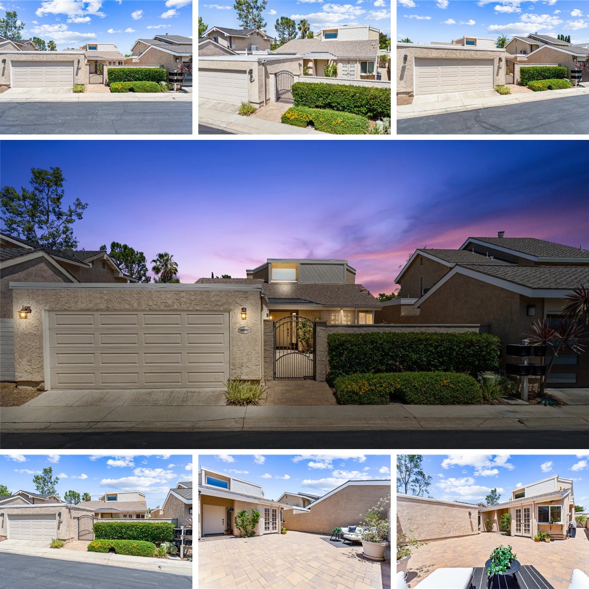 Discover highly desirable single-level living in this remodeled 2-bedroom plus den, 2-bath home nestled on a cul-de-sac in Laguna Niguel. Spanning 1,574 square feet, this bright, open-concept residence has been updated throughout. As you arrive, private front and rear patios with low maintenance, interlocking pavers welcome you into the foyer entry with a side-panel window for extra light. Vaulted ceilings soar over the living and dining areas, anchored by a dual-sided gas fireplace finished in contemporary porcelain tile. Adjacent, a designated dining area with chandelier lighting and sliding doors creates an effortless indoor-outdoor flow to the rear patio—ideal for al fresco entertaining. The heart of the home, the kitchen, boasts classic laminate wood cabinetry topped with durable granite counters, spacious pantry cabinets, and a breakfast/workstation nook under a tray ceiling with recessed lighting. Stainless steel appliances (including a brand-new dishwasher), reverse-osmosis filtration, and brushed-nickel fixtures elevate both form and function. French doors open from the kitchen to the front courtyard, bathing the space in natural light. A versatile bonus room, den or home office lies just off the main living area, or you have the option to convert into a third bedroom. The inside laundry room is equipped with abundant cabinet storage and a whole-house water softener for added convenience. Retreat to the serene master suite, where dual granite-topped vanities, updated sinks and lighting, and a fully remodeled walk-in shower await. Triple mirrored closet doors and a dedicated walk-in closet ensure ample storage, while sliding doors open to the front courtyard. The second bedroom features sliding mirrored closets and direct patio access, complementing the guest bath’s dual granite vanities and updated finishes. Additional highlights include porcelain flooring in the kitchen and baths, 5? baseboards, new interior paint, Milgard vinyl windows and sliding doors, and a detached two-car garage with built-in storage cabinets. All kitchen appliances are included. Experience the best of Laguna Niguel living at 28082 Palmetto Court—where thoughtful upgrades, indoor-outdoor harmony, and effortless style come together in one exceptional home.